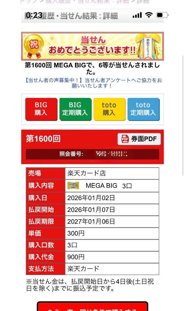 2026年最初のMEGA BIGで末等が当たりました!